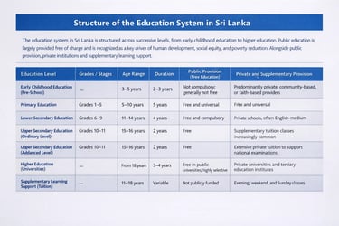 The education system in Sri Lanka is organized into several progressive levels, ranging from early childhood to higher education.