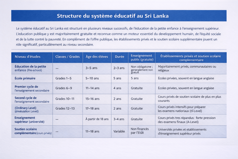Le système éducatif du Sri Lanka est organisé en plusieurs niveaux progressifs, allant de la petite enfance à l’enseignement supérieur.